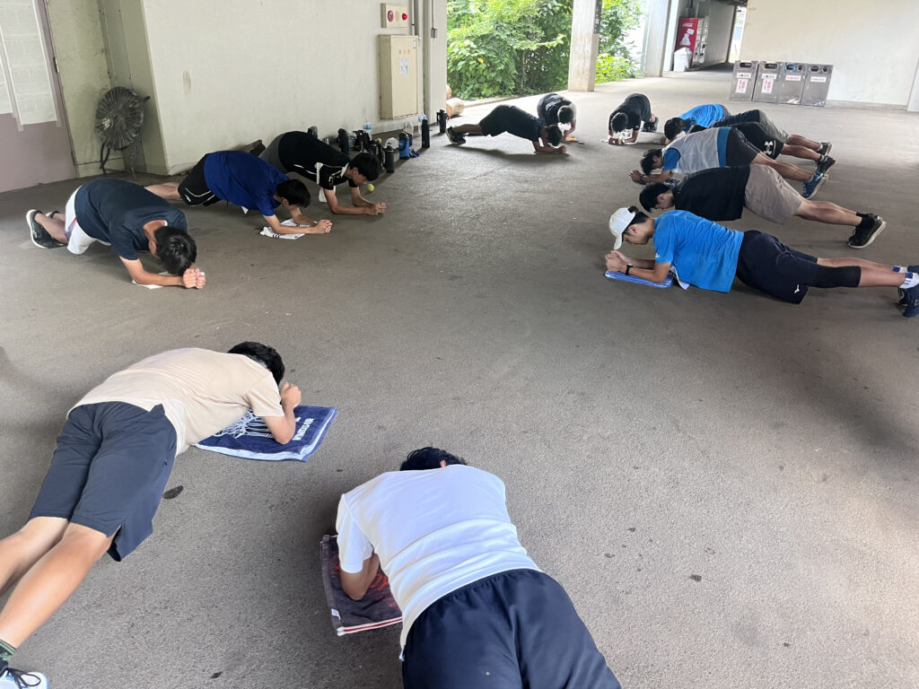 最後の全体練では、部員全員でポーチボレーを16個の的に10分間で当てるという練習をしました。昨日の全体練習では、1個の的が残ってしまったのですが、今日の1回目では、昨日よりも多い、5個の的が残ってしまいました。コーチの方々に雰囲気が悪いと喝を入れられてしまい、部員全員が反省しました。気を引き締めて行った2回目では、なんと的を全て当てることができました。